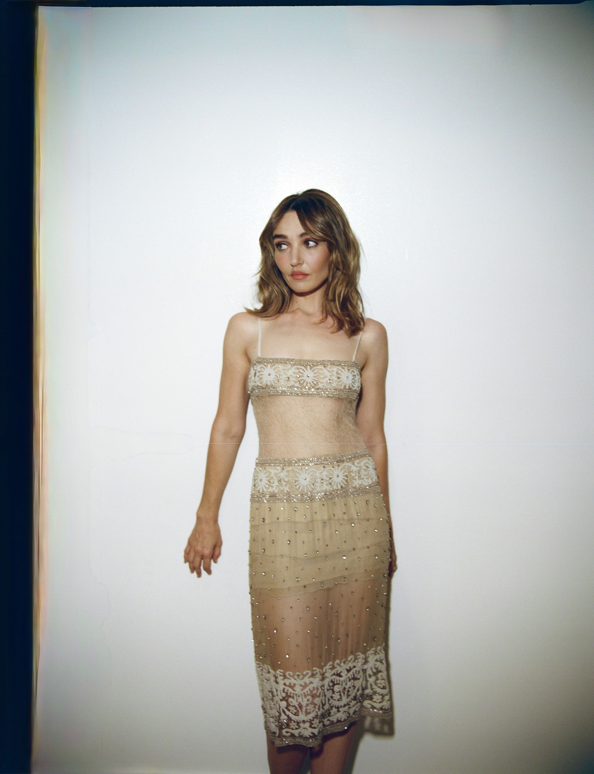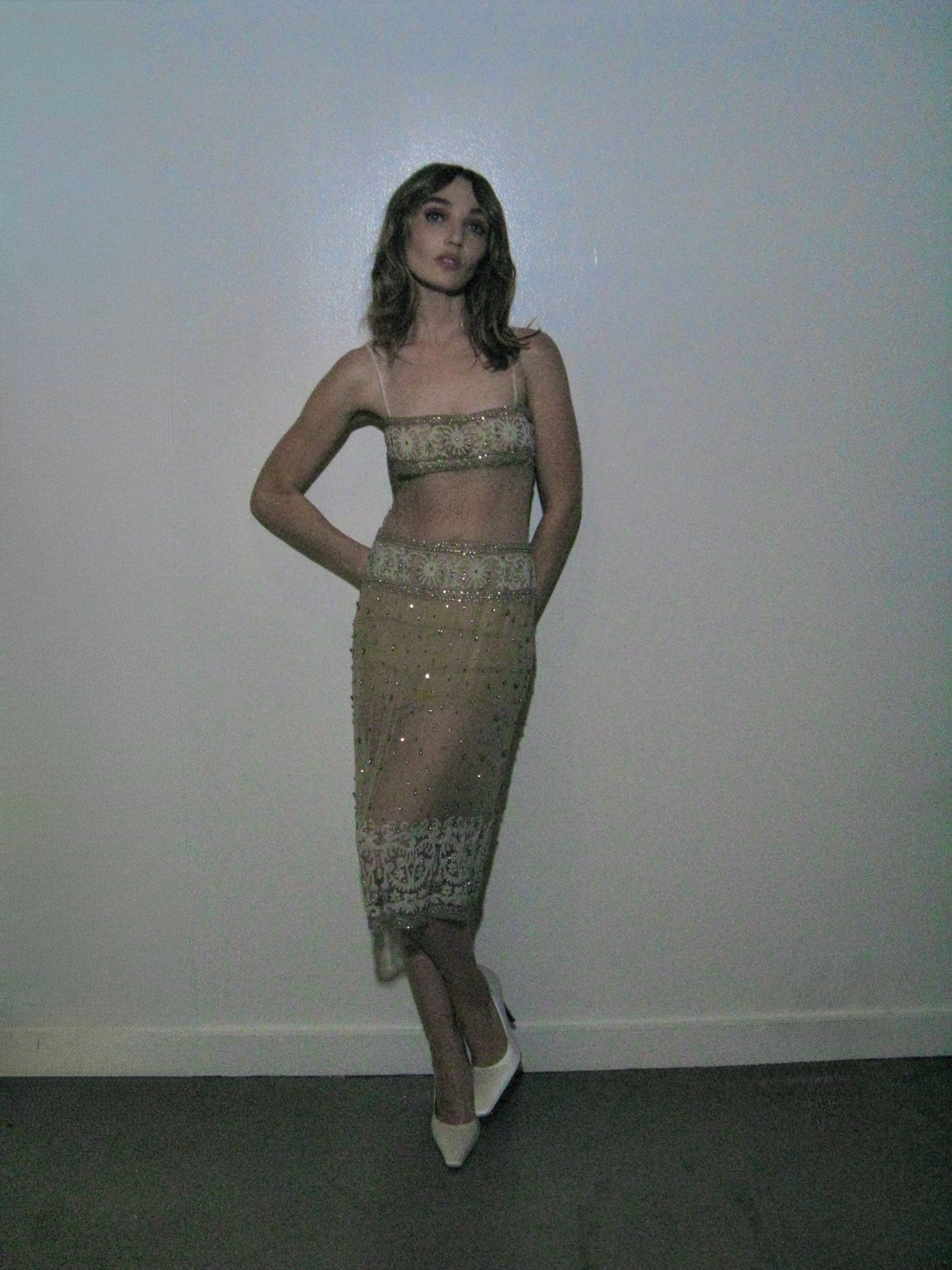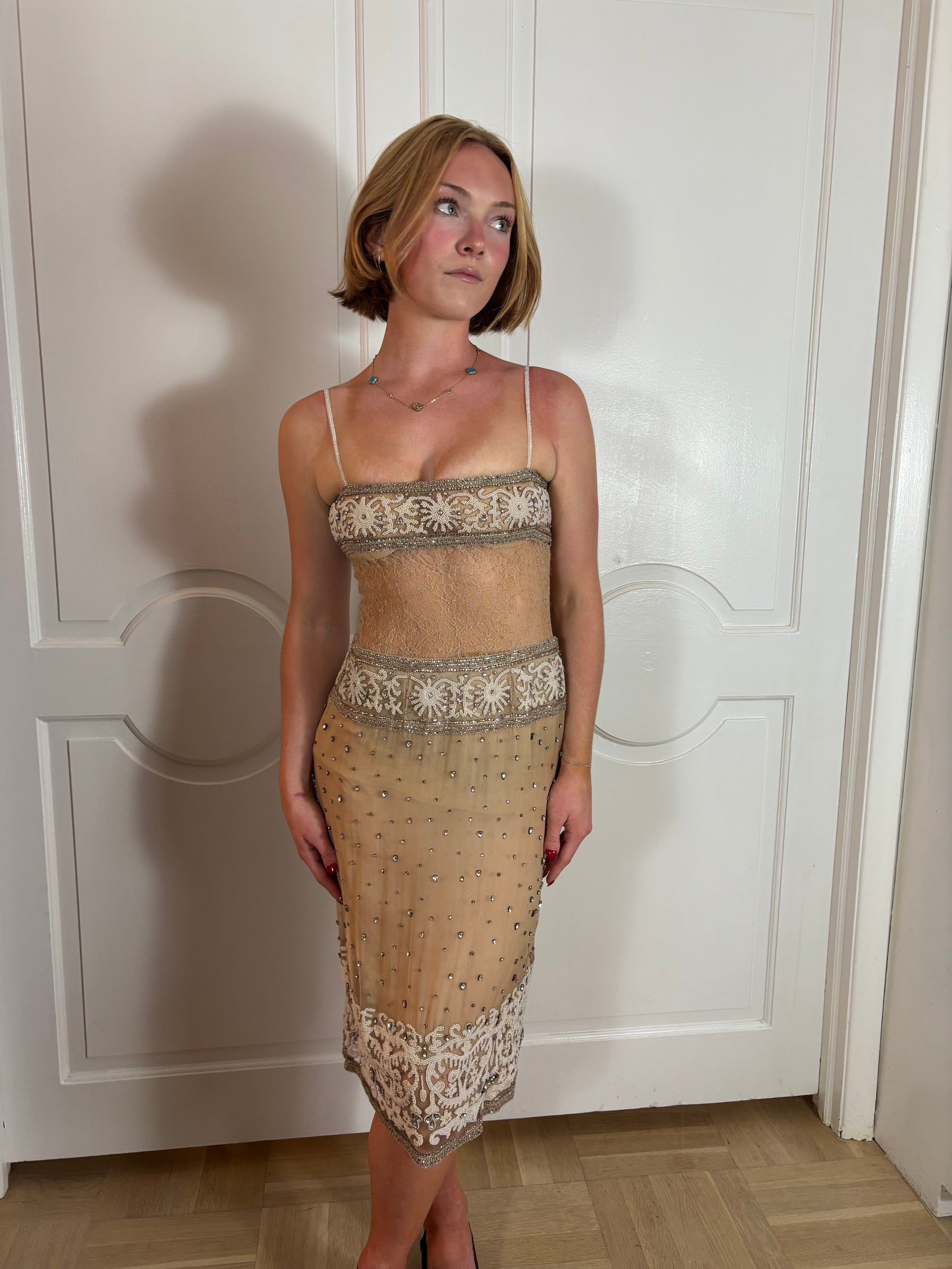 Super rare FW2000 Valentino Runway Dress Modeled by Gisele Bündchen. Featured in the campaign photos taken by Steven Meisel. An archival piece. Adorned with lace, beaded straps, beading throughout.