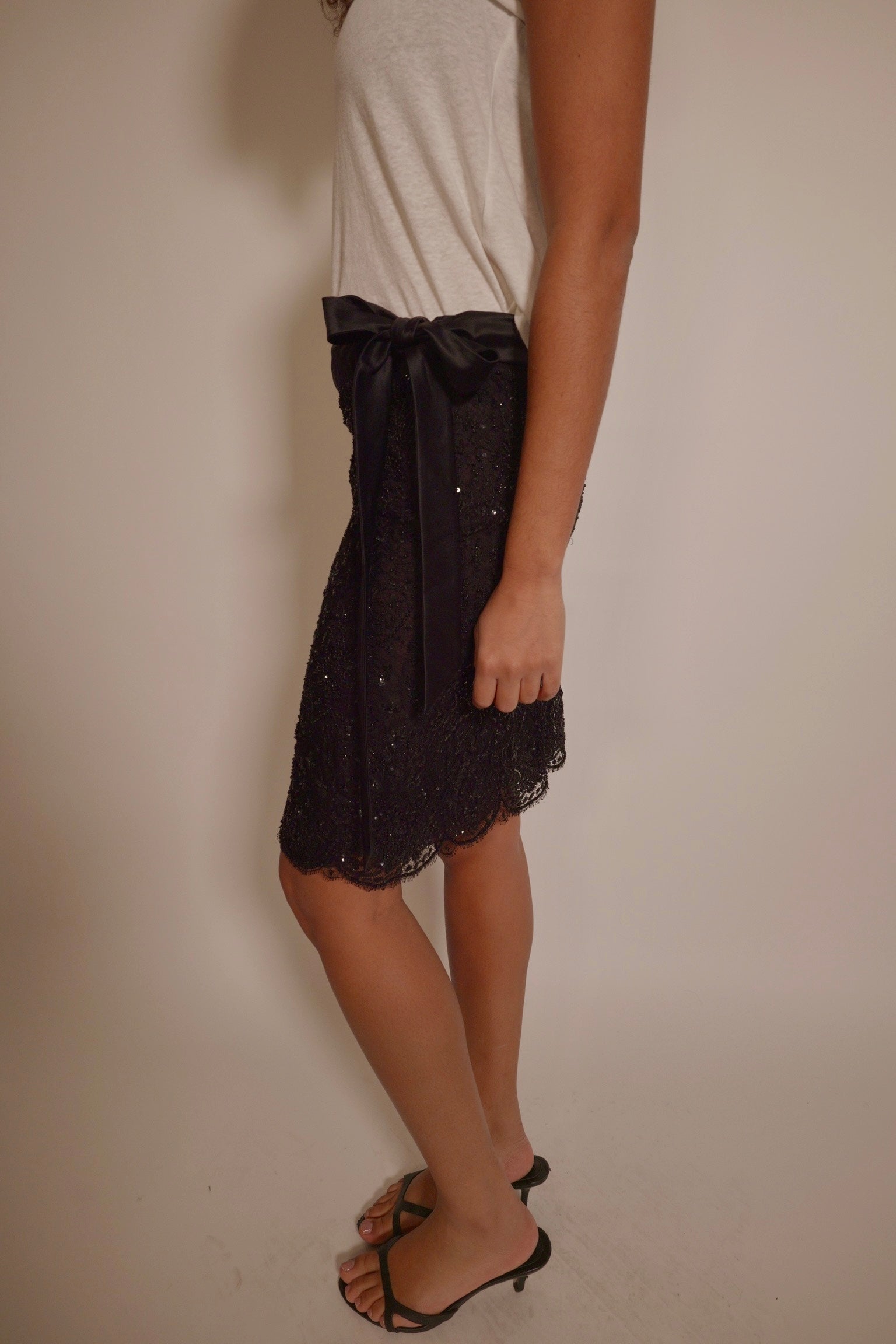 Silk, lace trimming, ties at the side