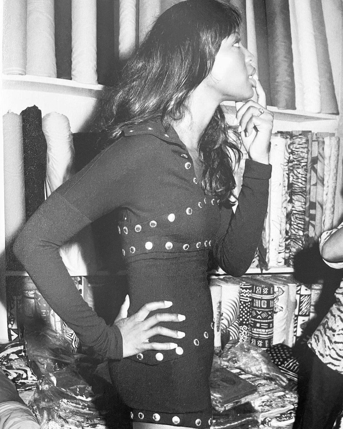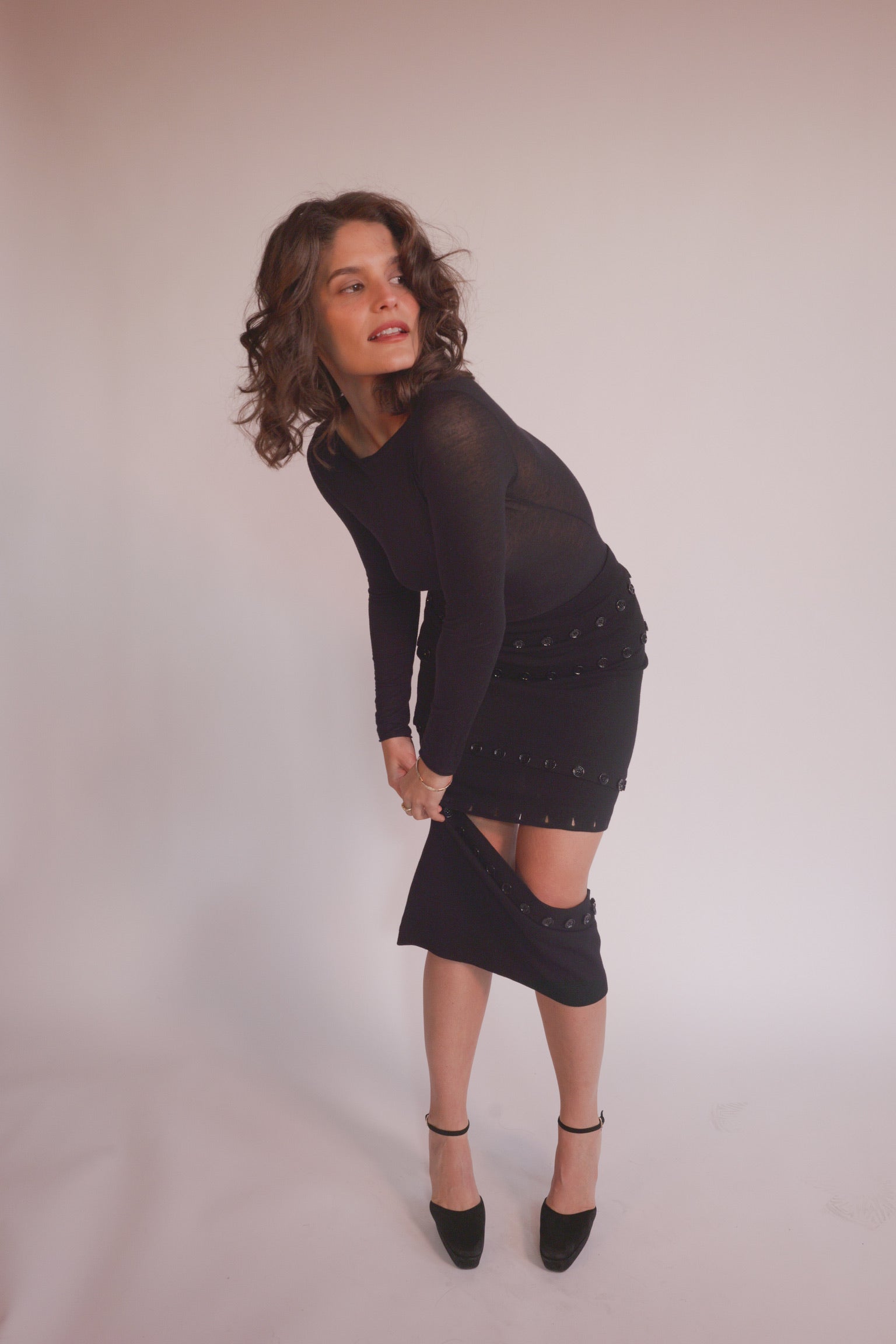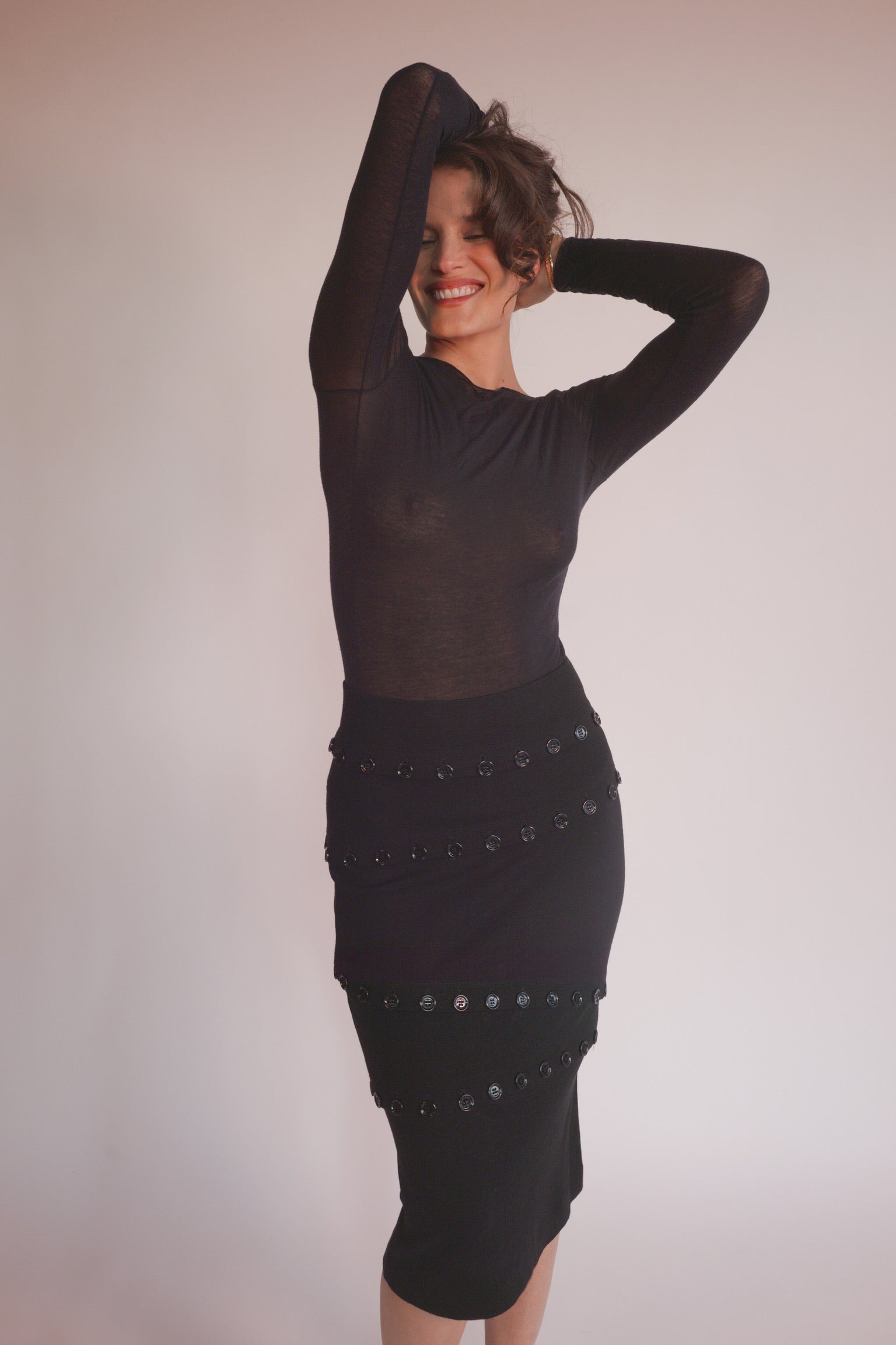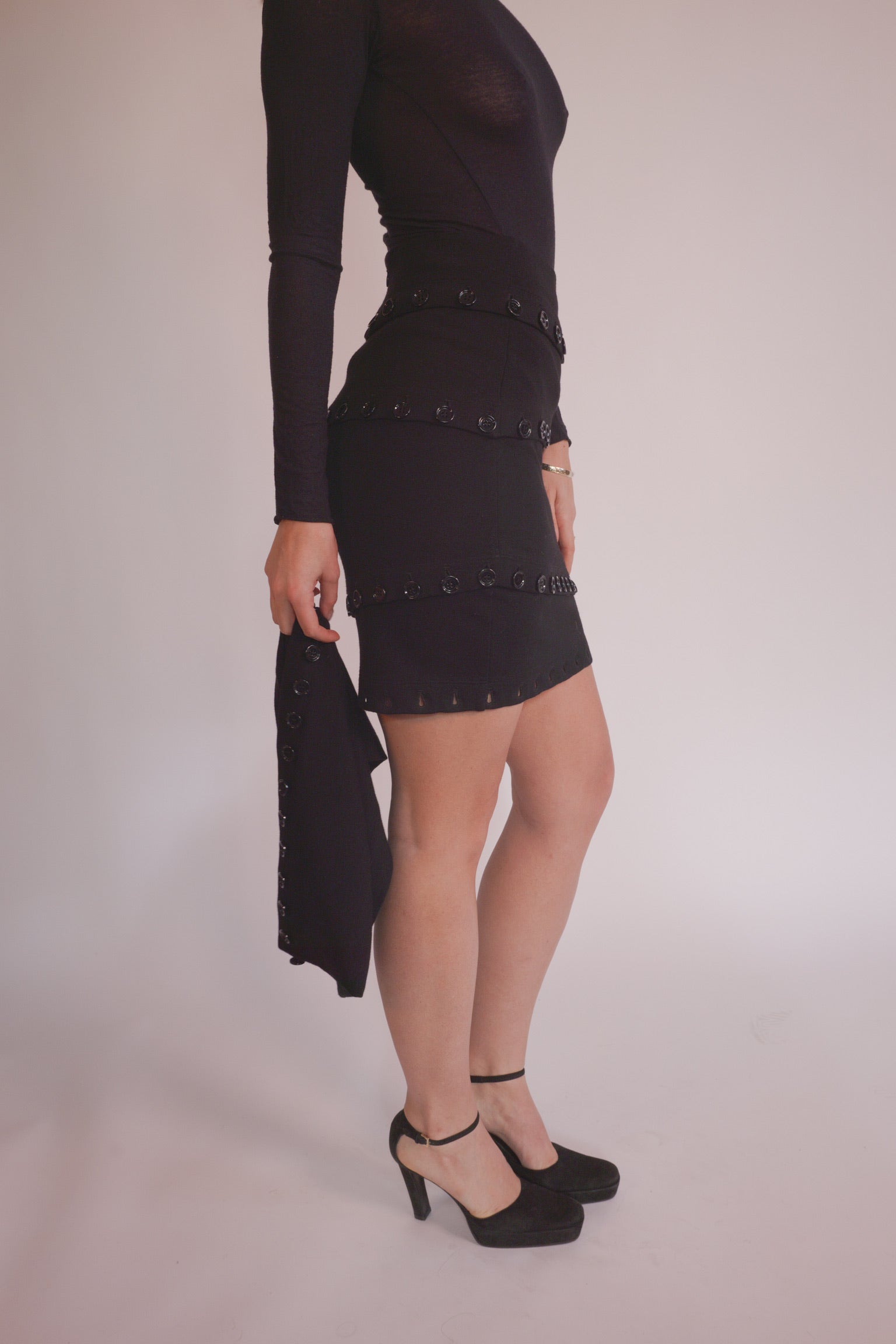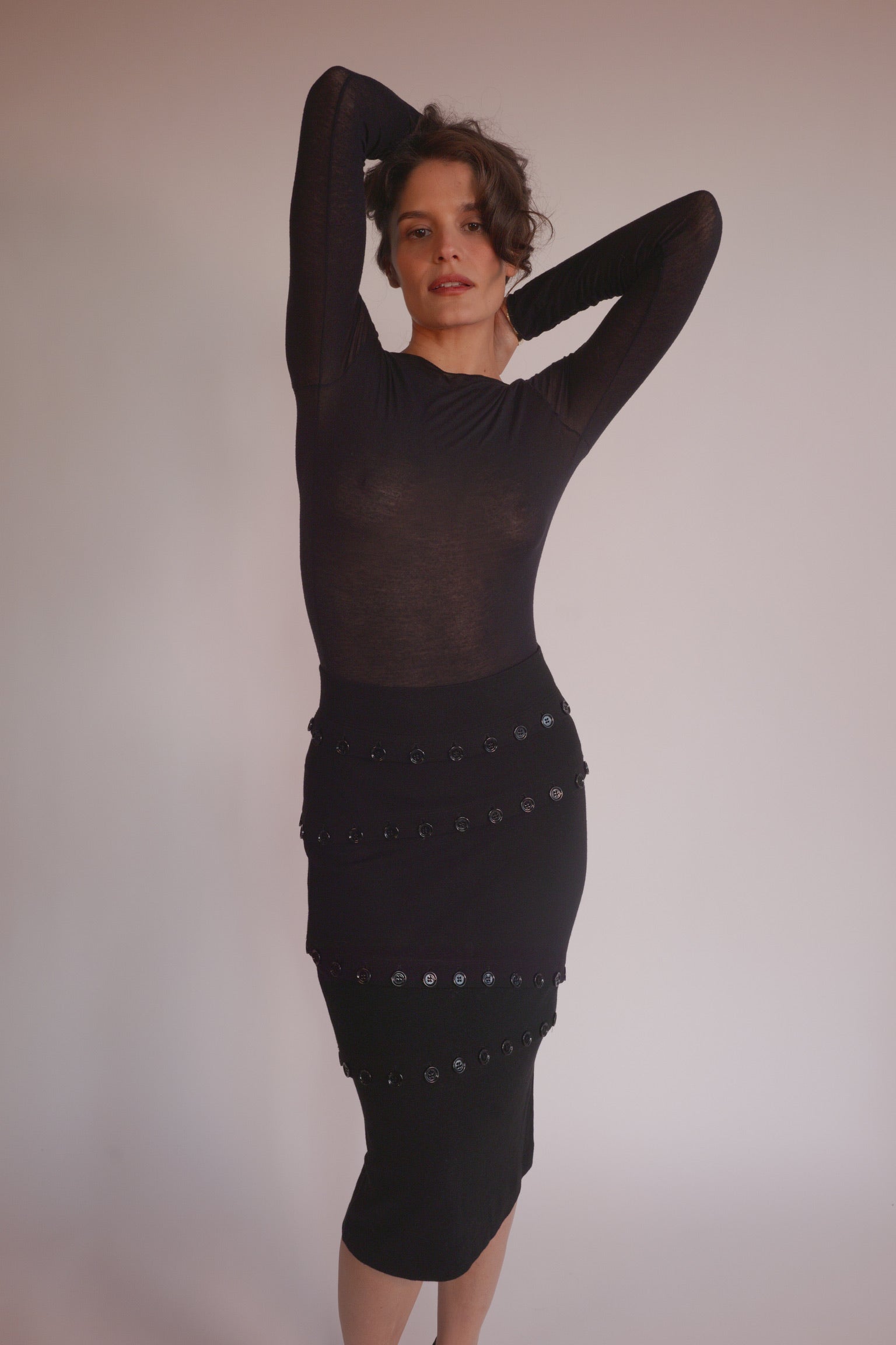 The form-fitting, calf-length skirt is adorned with large black button accents, allowing it to be styled in various ways to suit the wearer's preference.