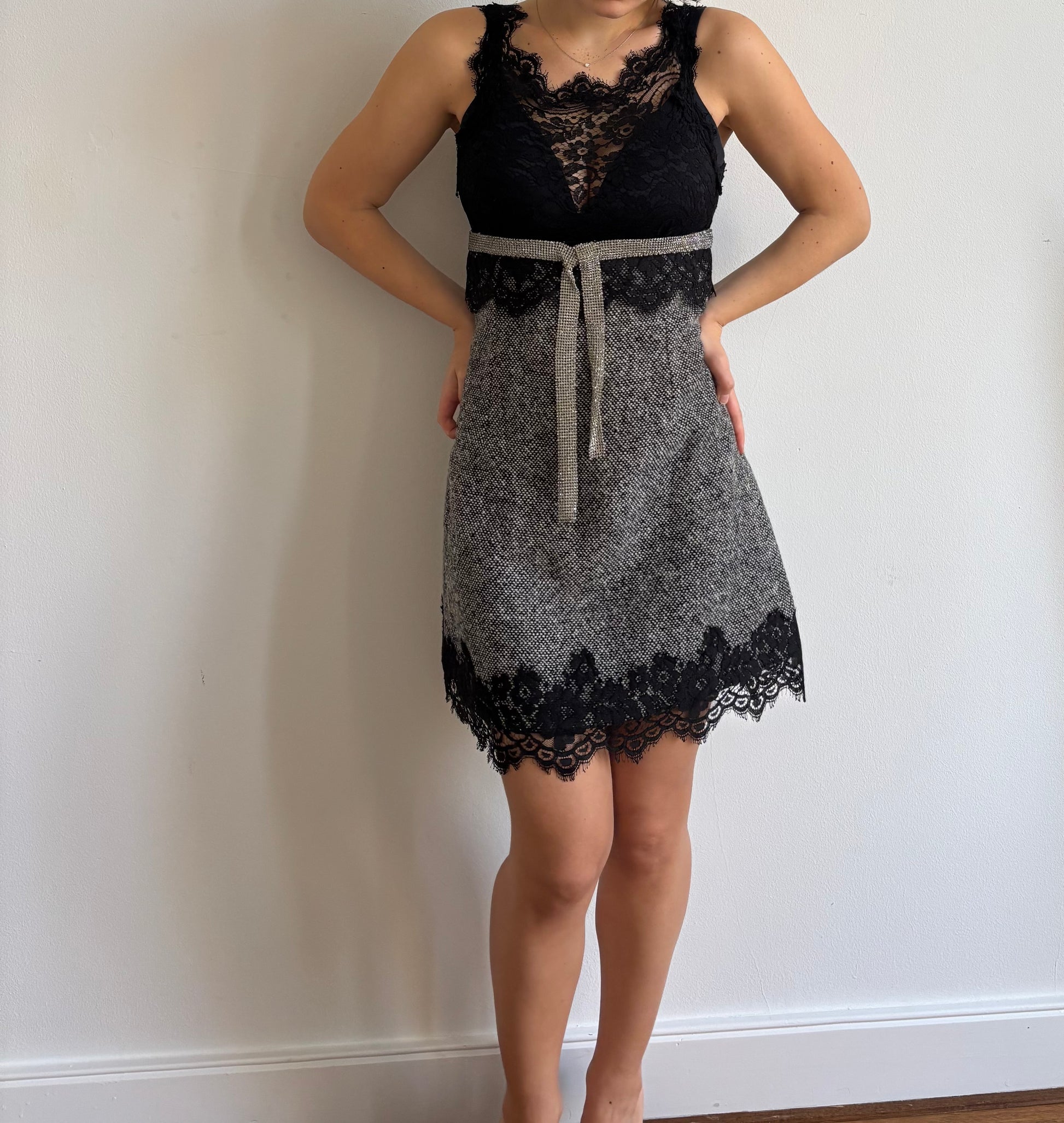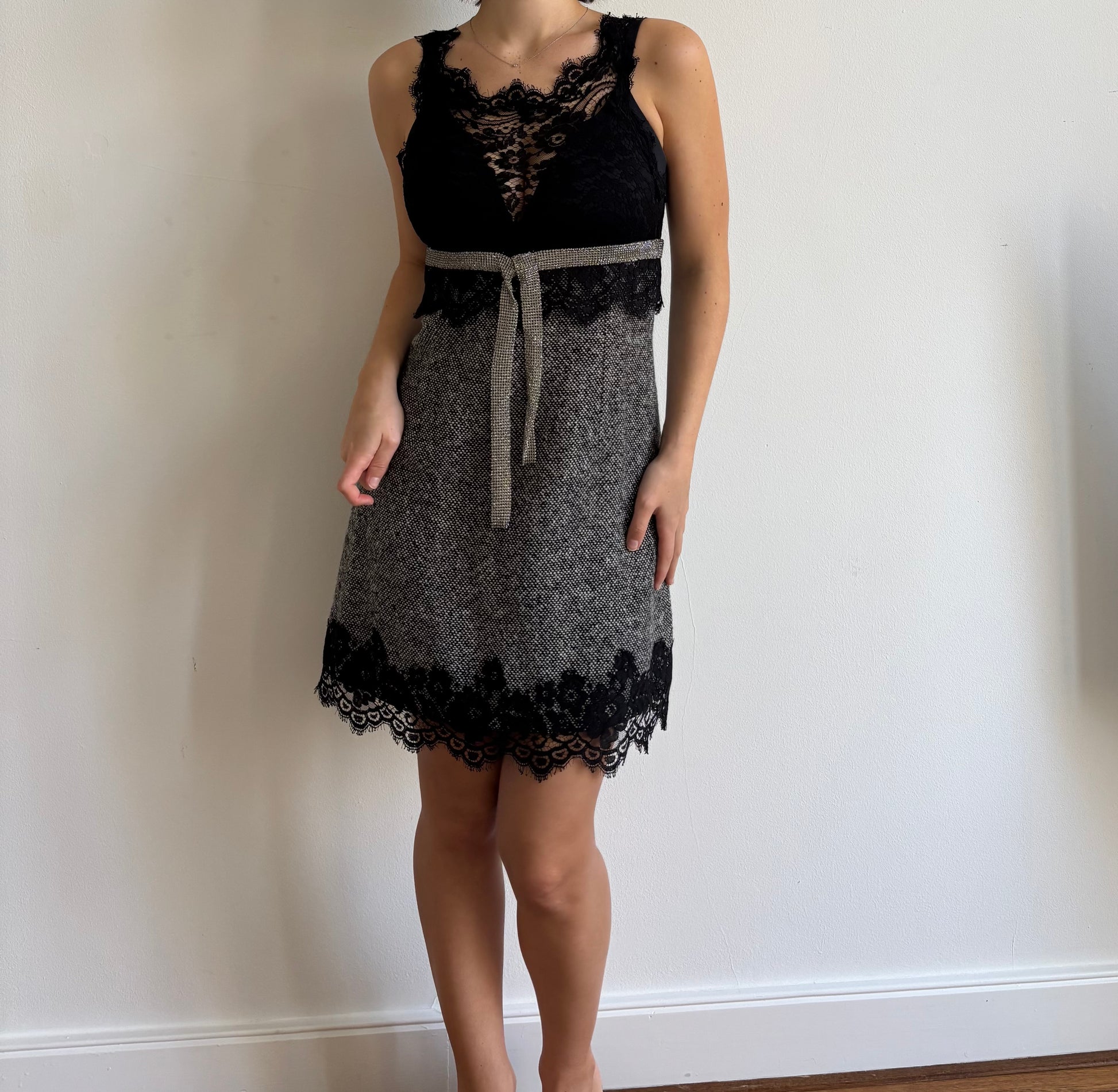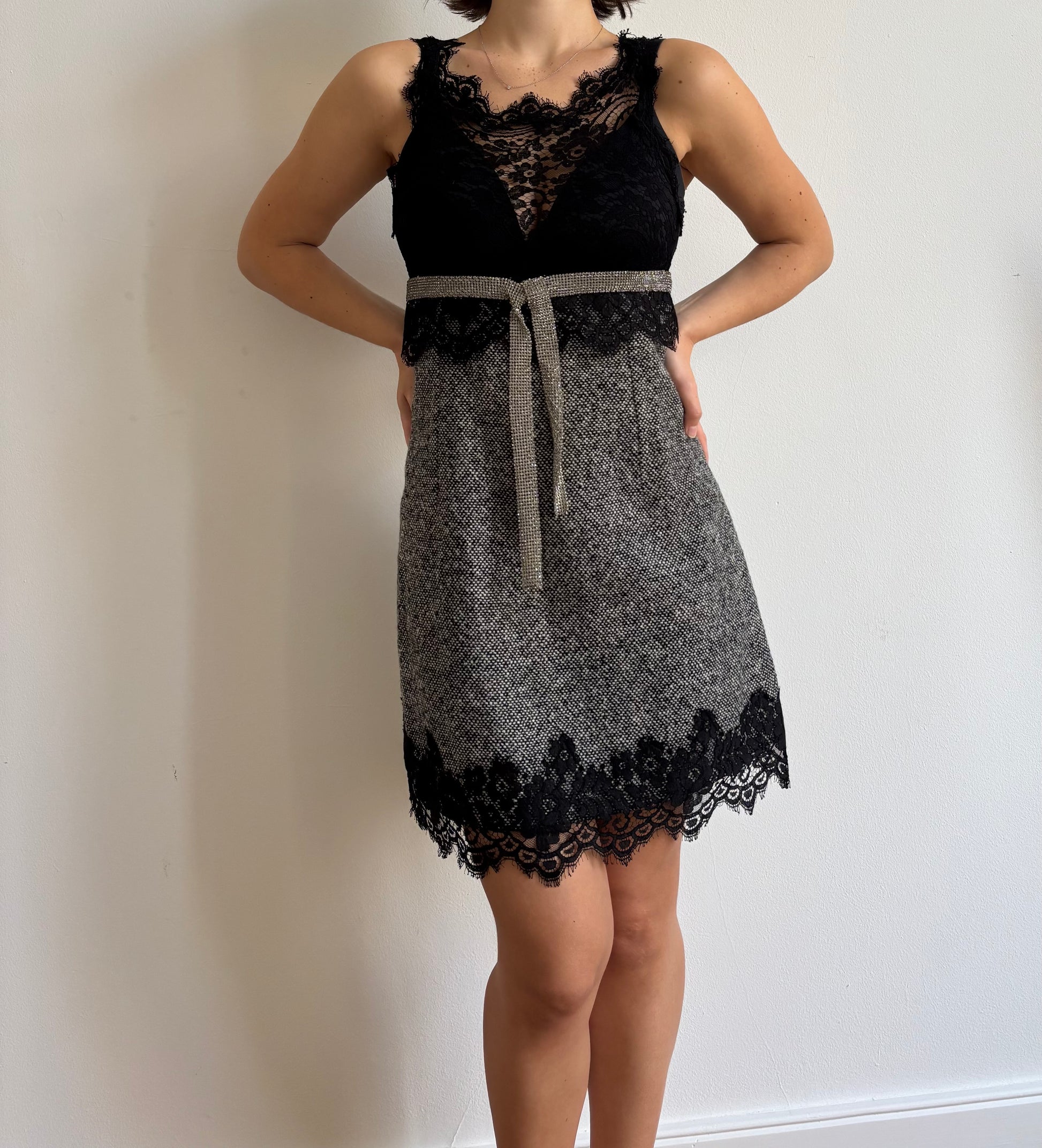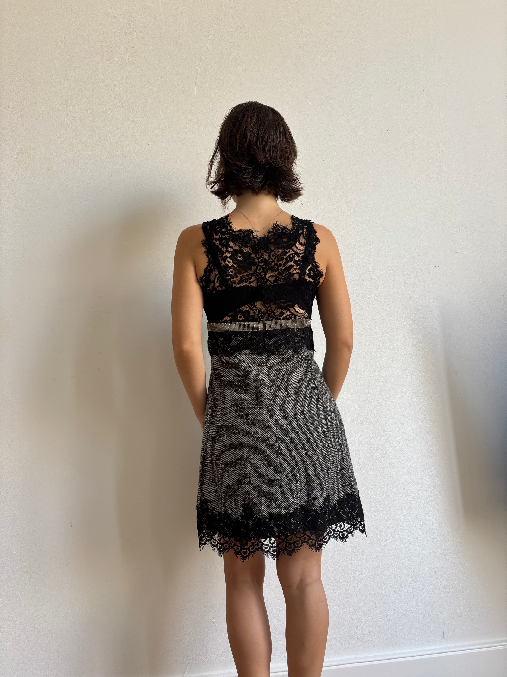 Rare FW2004 Dolce & Gabbana runway wool dress with lace and crystal detail. Lined with silk.