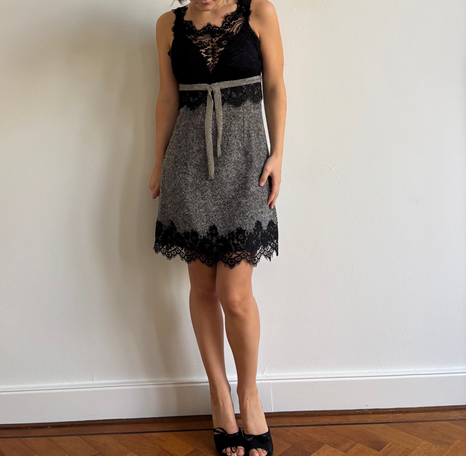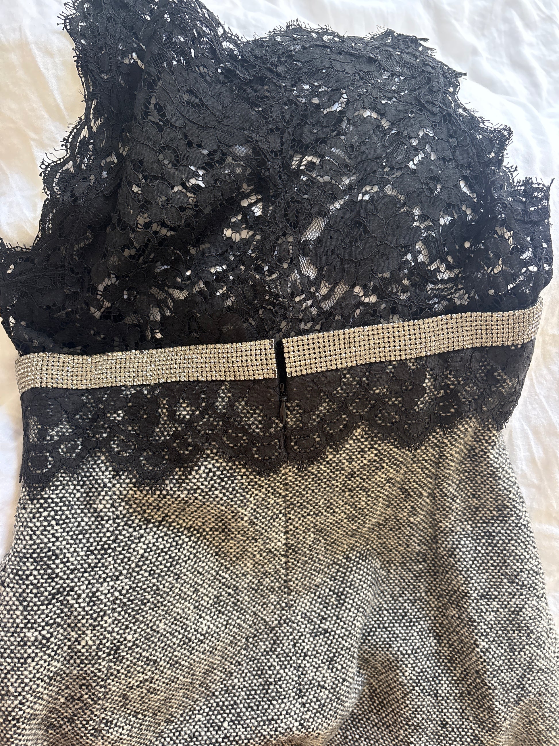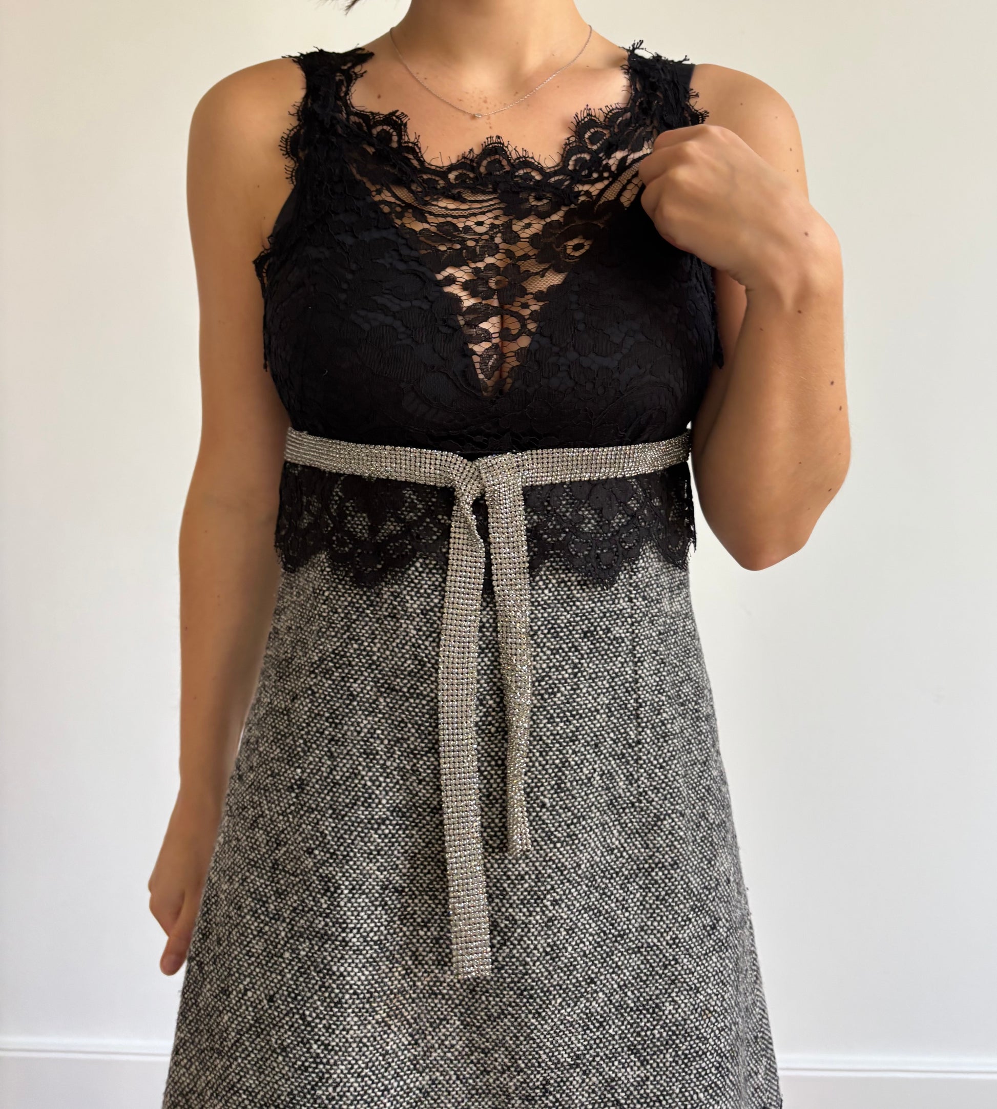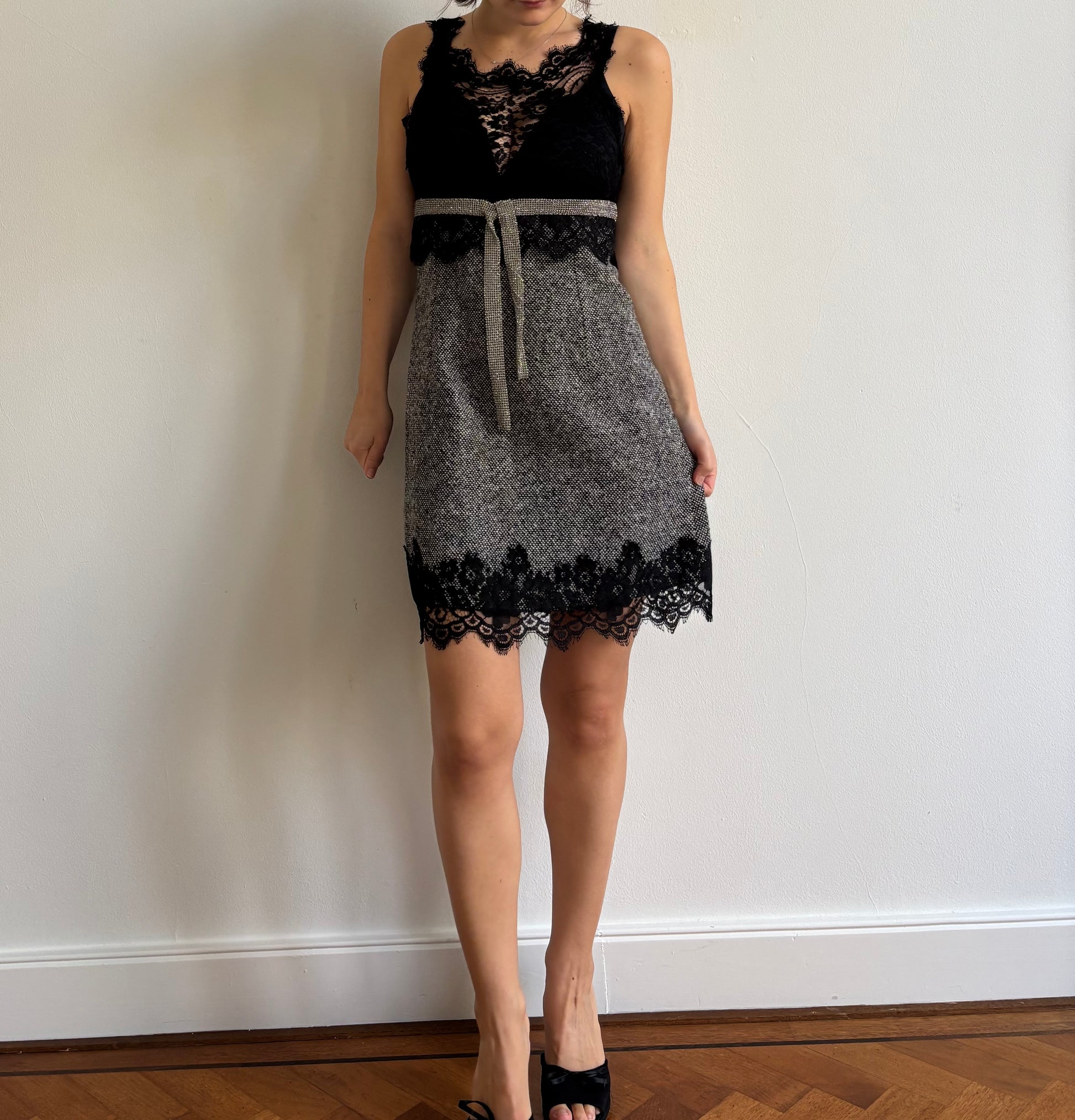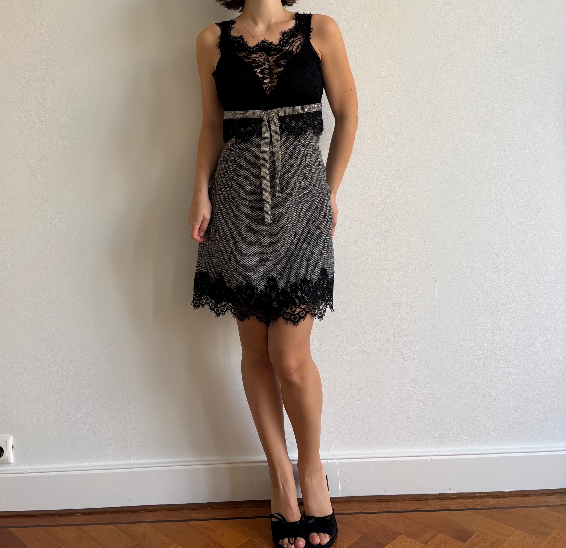 Rare FW2004 Dolce & Gabbana runway wool dress with lace and crystal detail. Lined with silk.