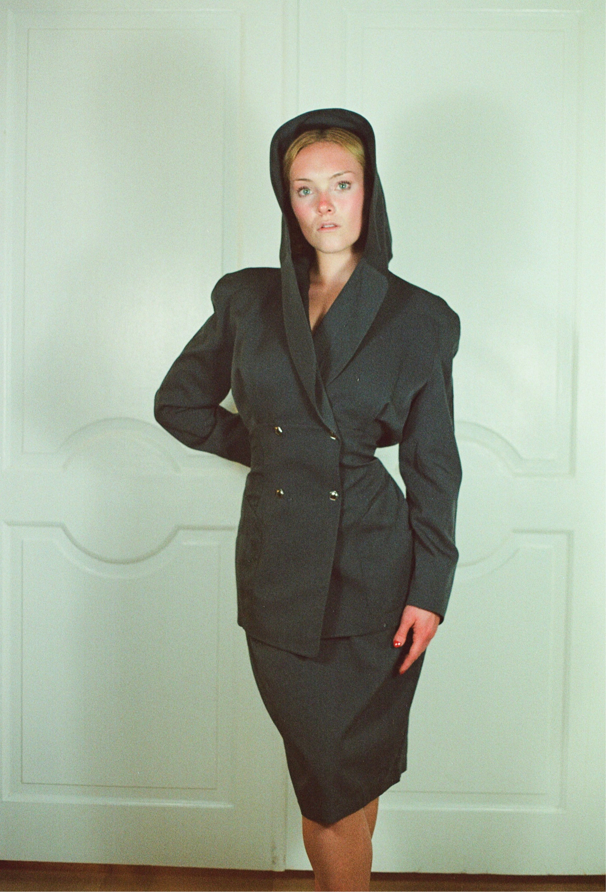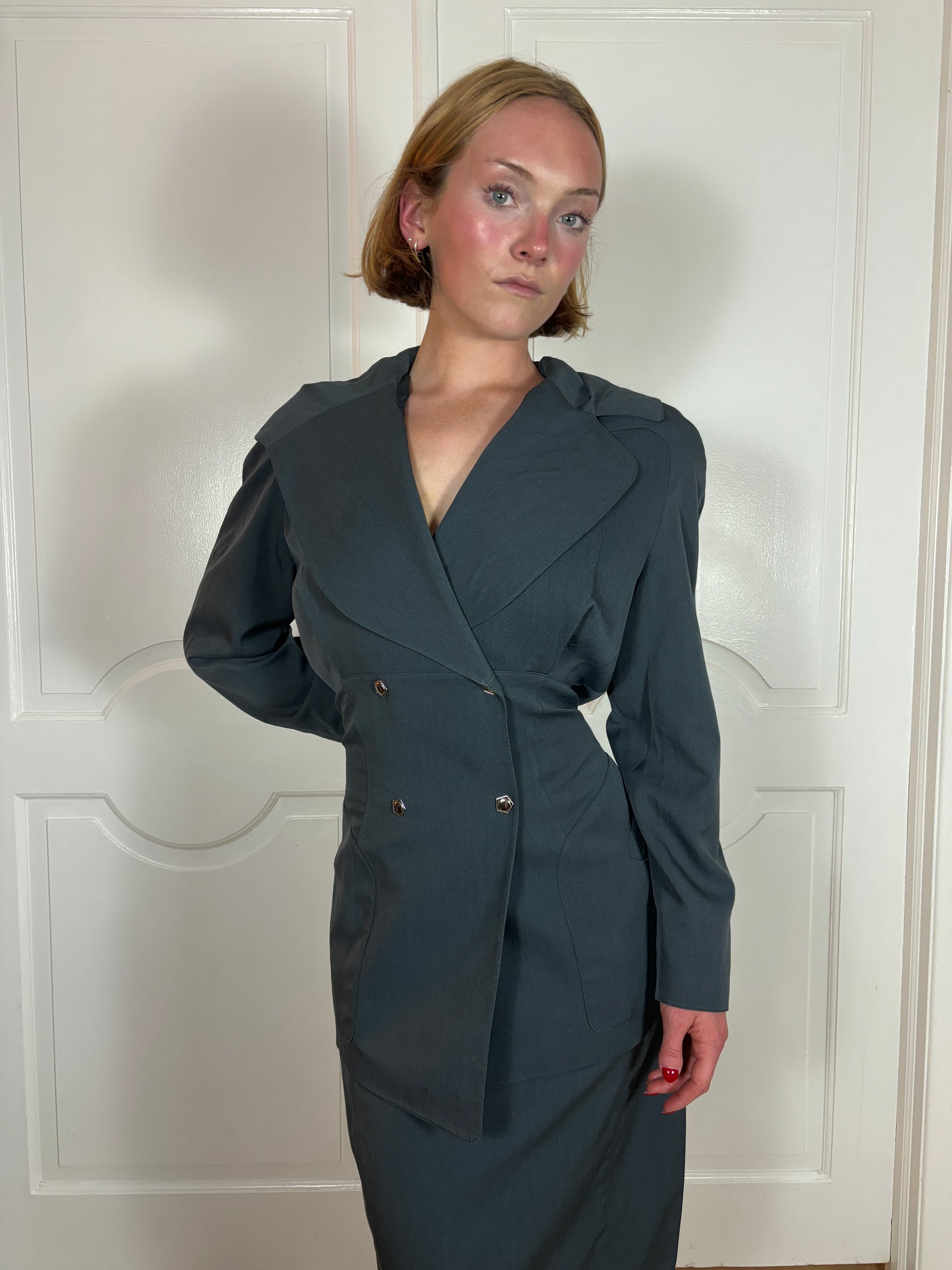 structured blazer, vintage skirt, tailored fit, classic style, dark green, pinstripe, sophisticated, power suit, minimalist, high-fashion