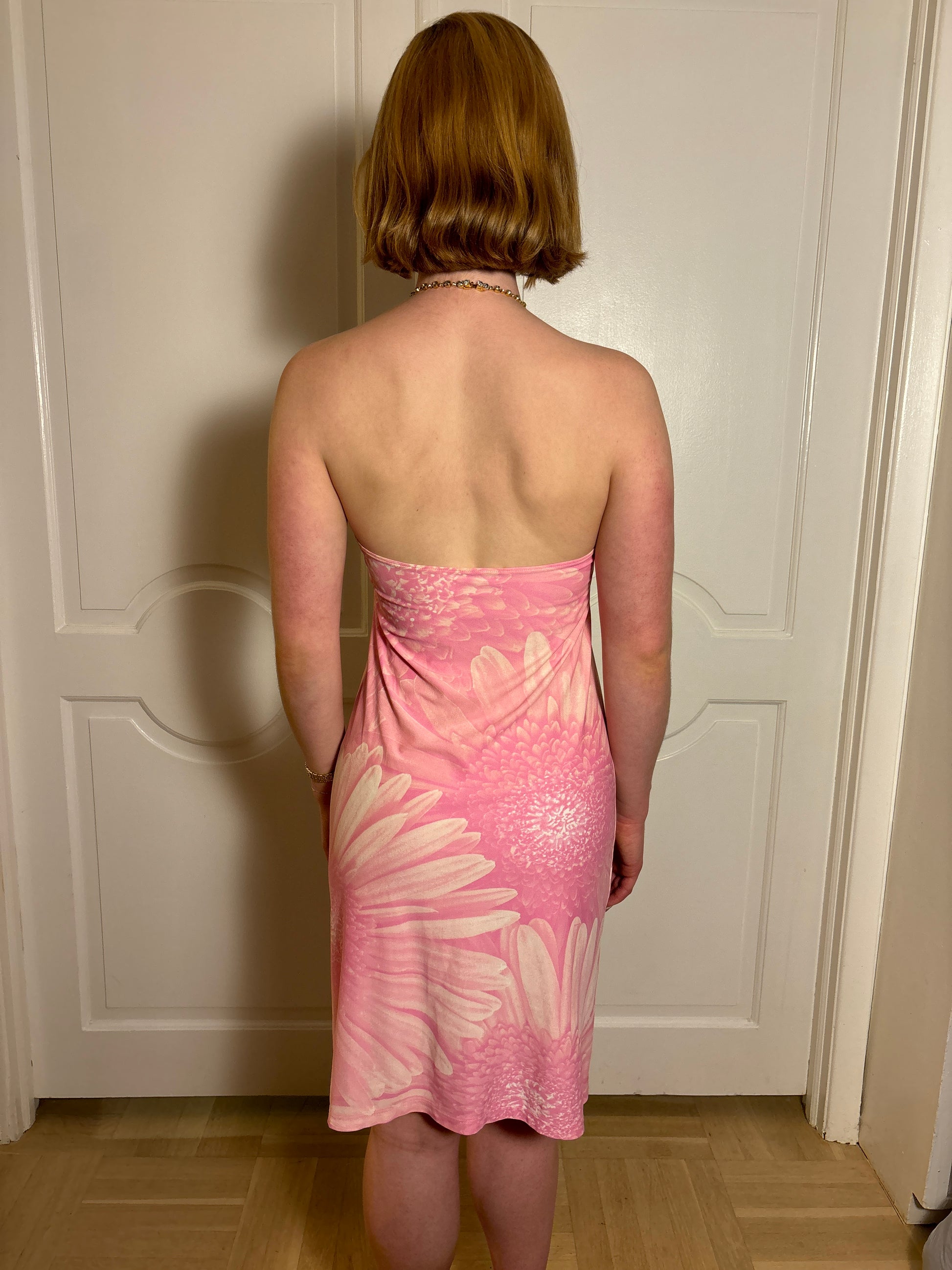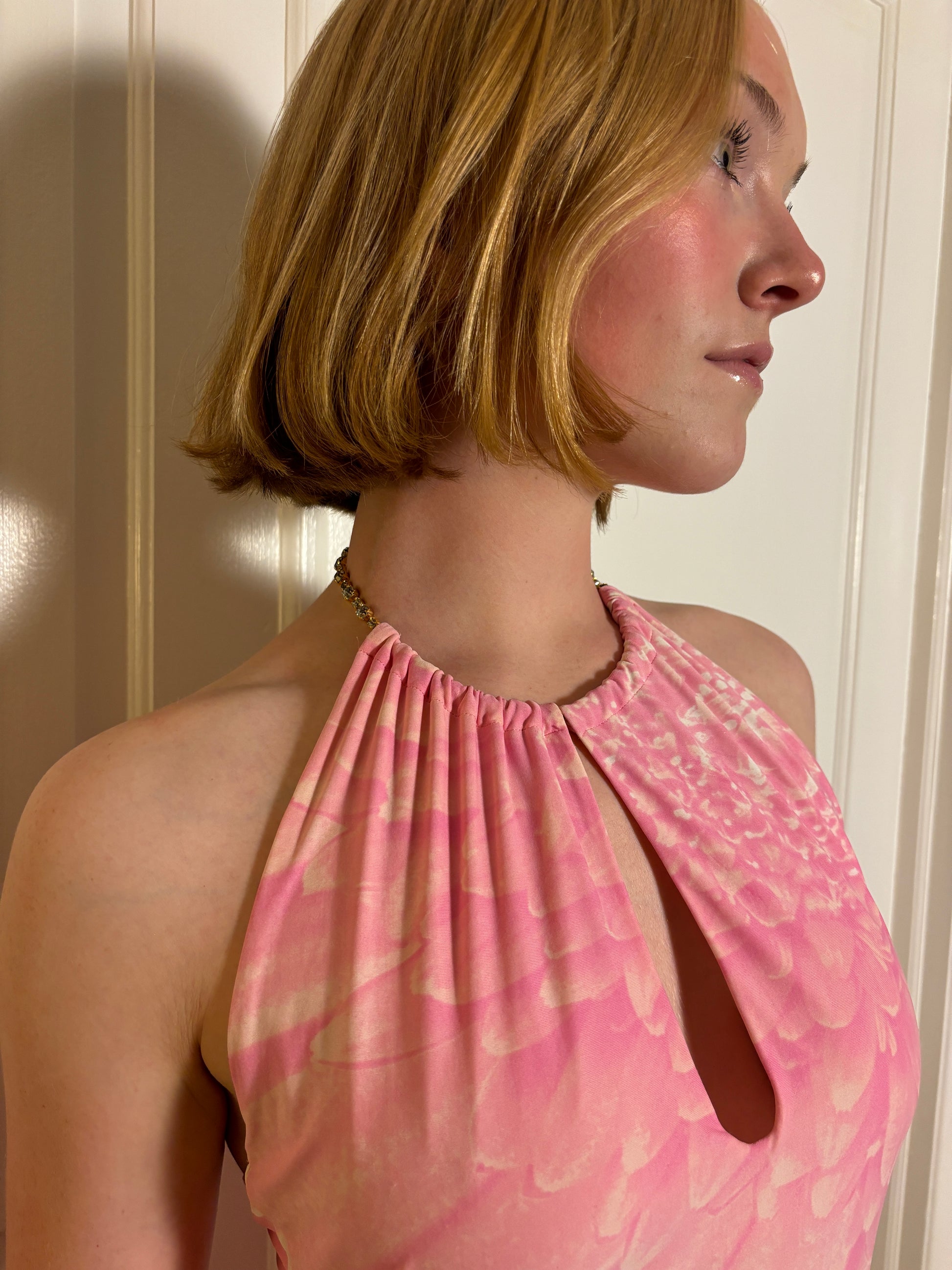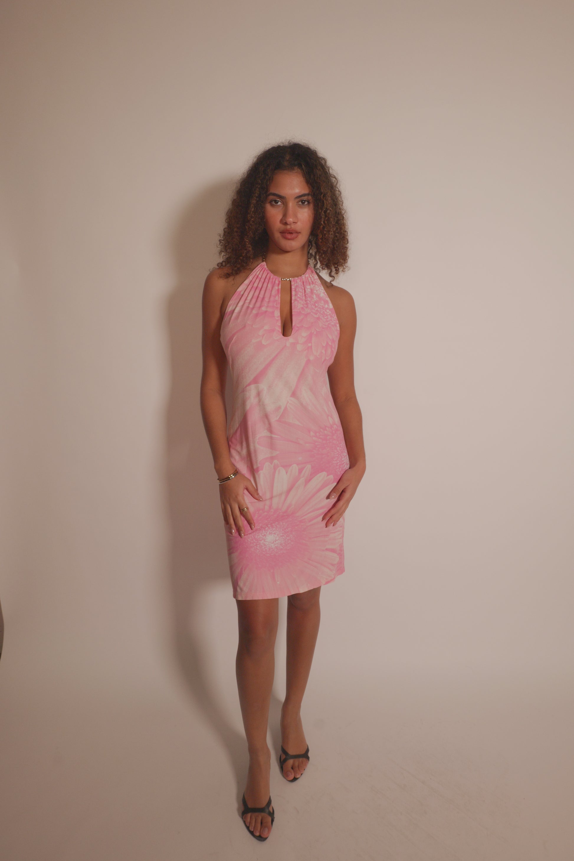 Iconic SS 2000 Roberto Cavalli Pink floral dress with gorgeous rhinestone beaded neckline resembling a necklace!